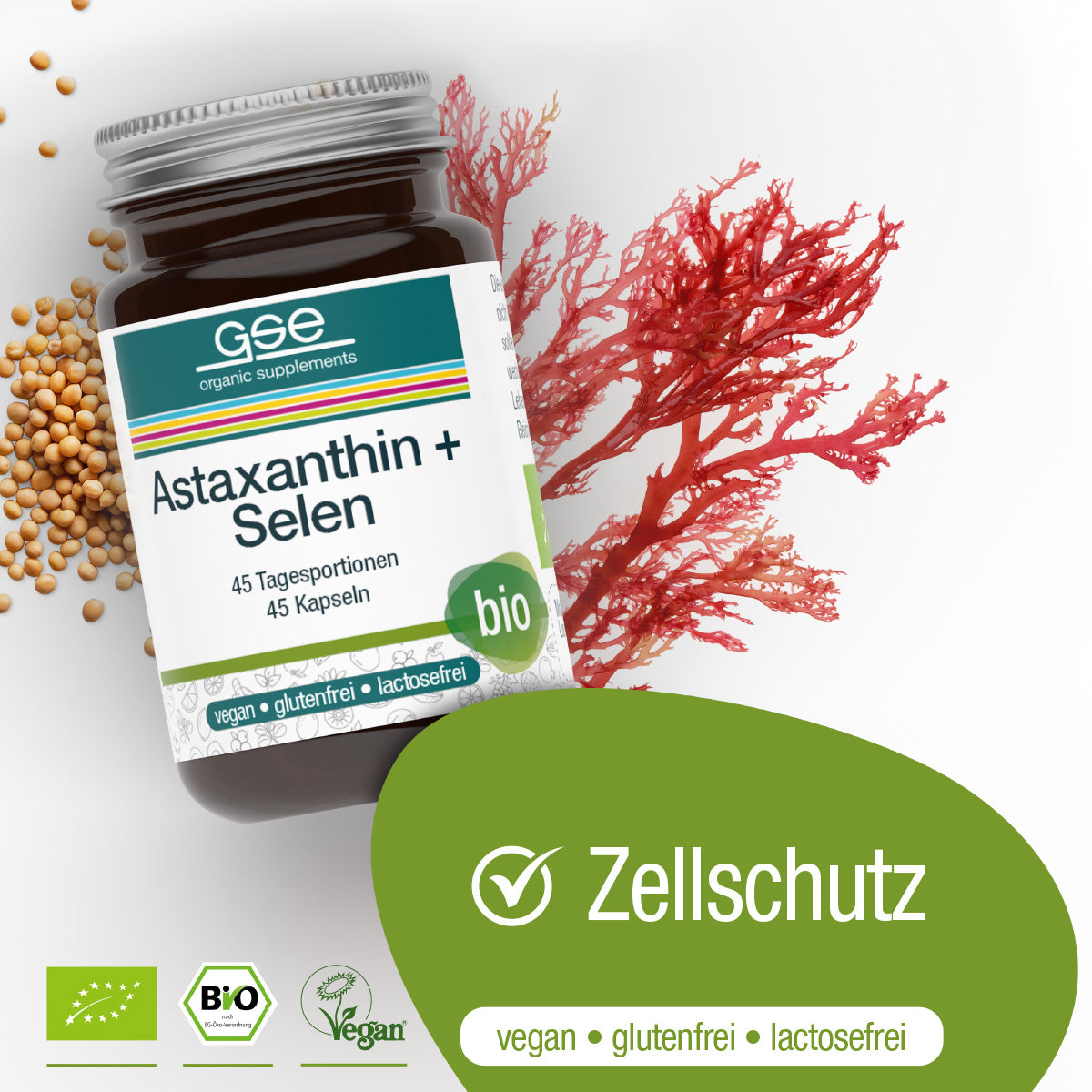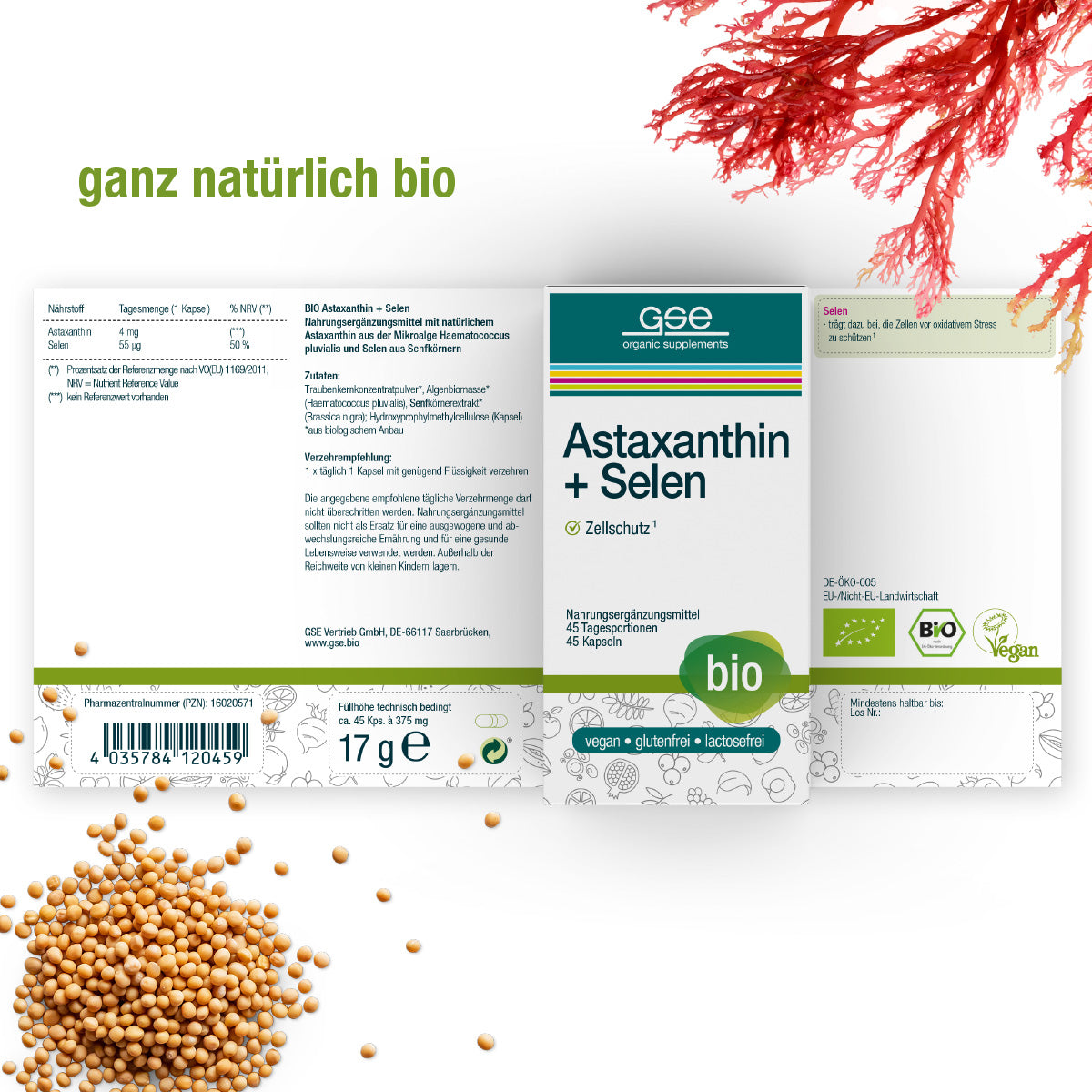 The blood rain algae (Haematococcus pluvialis) is a microalgae known for its impressive red coloration, which it increasingly produces under difficult living conditions as a protective reaction. Responsible for this is the carotenoid astaxanthin, which is also found in various types of fruit and vegetables and also causes the characteristic coloration of salmon and flamingos, for example. The natural selenium for our BIO Astaxanthin + Selenium capsules comes from an organic mustard seed extract. Black mustard (Brassica nigra) is a plant species from the genus Brassica in the cruciferous family (Brassicaceae). Selenium helps to protect cells from oxidative stress. The grape seed concentrate powder comes exclusively from grapes cultivated according to the rules of organic farming. Grape seeds are rich in natural OPCs (oligomeric proanthycyanidins). OPCs are classified as secondary plant substances, which are used by plants as defense substances against harmful external, environmental influences, among other things.